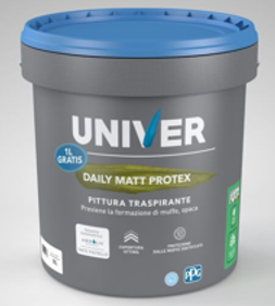 DAILY MAT PROTEX: Water-based paint for interiors with low environmental impact. The product is formulated for preventing the formation of mould on walls, certification issued by GFC Chimica according to UNI EN 15457:2014. Suitable for plasters, premixed, plaster and plasterboard surfaces. Scrub resistance class 3 according to EN 13300 . White -other colors reproducible with ABSOLU SYSTEM (pastel tint)