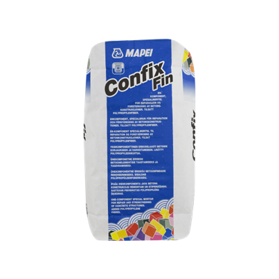 Confix FIN is a pumpable, cement based, dry mortar with a mix ratio of approx. 1:4 of cement / well graded aggregates up to 1.0 mm and with additives that provide good casting results and workability. Confix Fin, which is only to be added water, is designed for maximum density, firmness and low shrinkage. If the mortar is to be sprayed, it’s preferable to use the wet method. Confix Fin meets the requirement defined by EN 1504-9 “Products and Systems for the protection and repair of concrete structures: Definitions, requirements, quality control and evaluation of conformity.General principles for the use of products and systems,” and the minimum requirements described in EN 1504-3, “Structural and non-structural repair” for structural mortars of class R3.