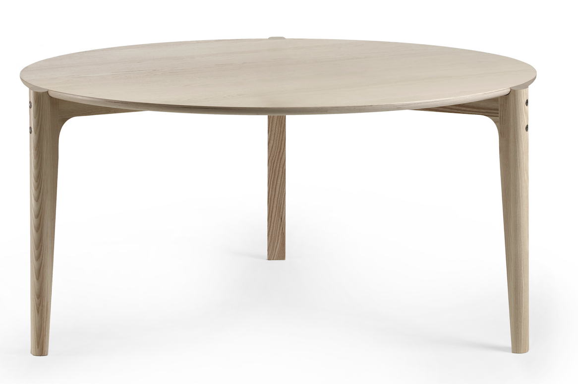 Tabletop with core and edge in birchplywood and surface in Desktop linoleum. Three legs in solid ashwood, coated with clear laquer containing 0,5% white pigments and integrated metal fittings. The fittings is attached to the tabletop with both screws and bolts attached to ramp sleeves up the tabletop. The table is packed and delivered in a corrugated cardboard box.