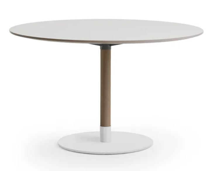 Tabletop with core and edge in birchplywood and highpressure (hp) laminate. One pillar in solid ashwood coated with clear laquer containing 0,5% white pigments, attached to metal foot diameter 600 mm painted RAL 9003 white