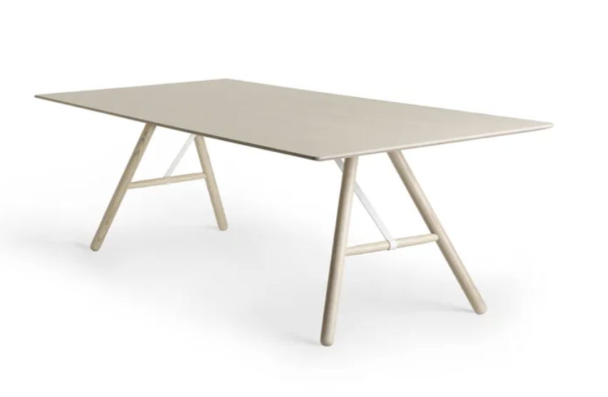 Tabletop with core and edge in birchplywood and 1,5 mm ash-venéer. Four legs in solid ashwood coated with clear laquer containing 0,5% white pigments. The wood fittings is attached to the tabletop with bolts and ramp sleeves up the tabletop. The table is packed and delivered in a corrugated cardboard box.