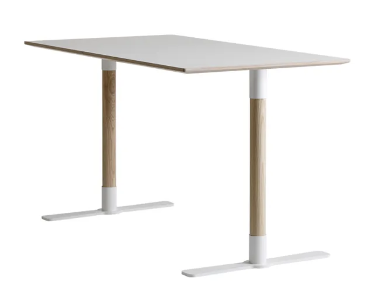 Tabletop with core and edge in birchplywood and highpressure (hp) laminate. Pillar in solid ashwood coated with clear laquer containing 0,5% white pigments, attached to metal foot 600 mm painted RAL 9003 white.