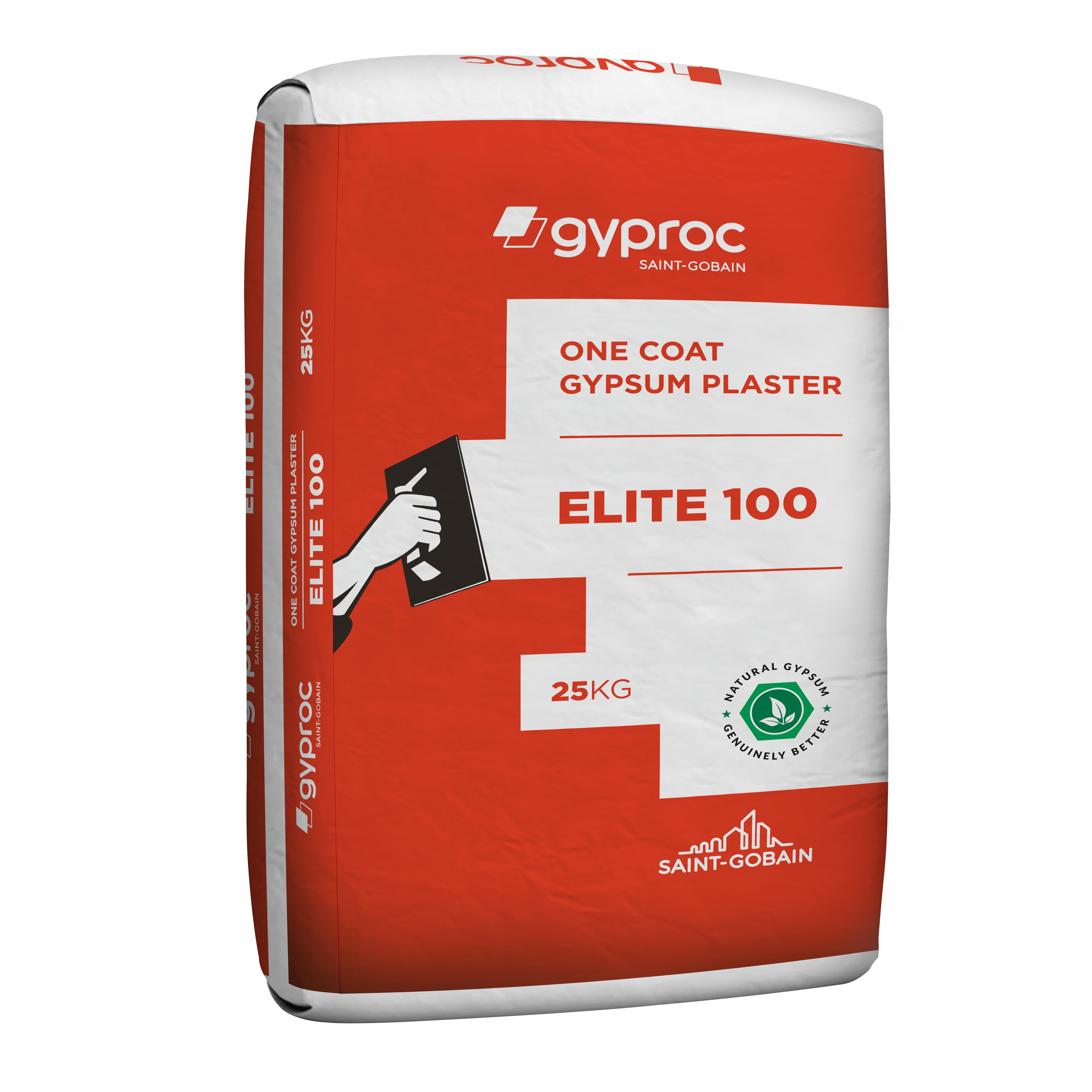 Gyproc Elite 100 is a one coat gypsum plaster for use on almost all Internal substrates, e.g. brickwork, blocks or concrete. It provides an Inert, smooth, high quality and durable base for application of decorative finishes over internal walls and ceilings. It is a lightweight, retarded hemihydrate, premixed gypsum plaster, with expanded perlite aggregates, requiring only the addition of clean water to prepare it for use.