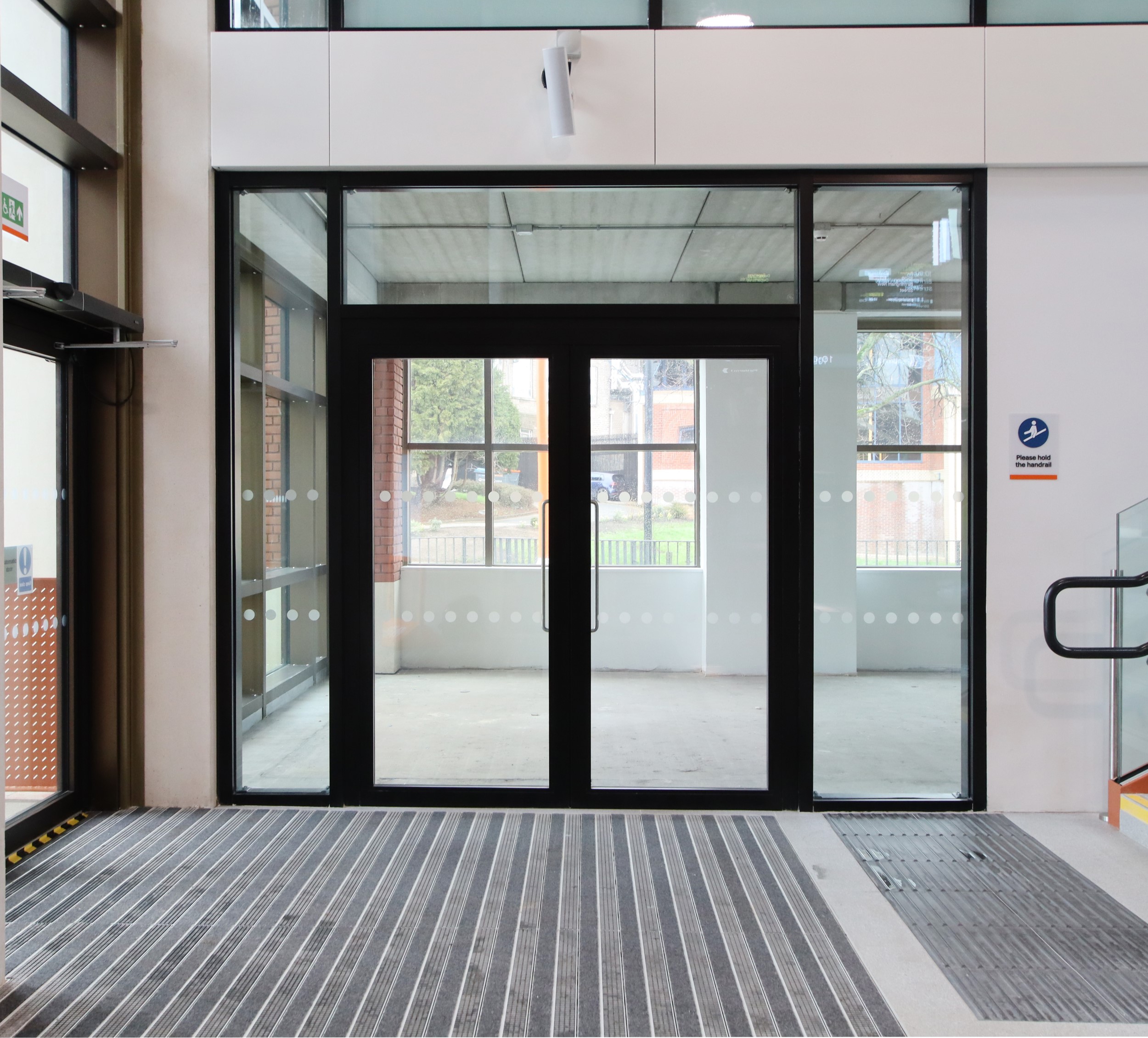 Technishield Façade is a thermally-insulated curtain wall system of mullion and transom construction, using a dry glazing system. In the standard version, mullions (vertical frame elements) 45mm wide x 110mm deep and transoms (horizontal frame elements) 45mm high x 90mm deep are used; more robust 60mm wide mullions are available as are less deep mullions & transoms. The system is available with different fire ratings from “EI30” to “EI120”, the glazing thickness and type varying according to the fire rating. The framework is constructed from powder-coated mild steel profiles.