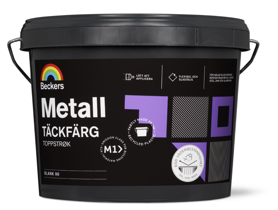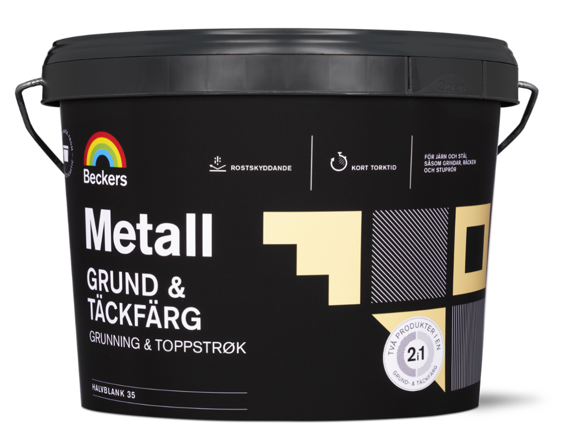 Metall Täckfärg: High-gloss waterborne metal topcoat that can be used on previously painted or primed metal surfaces such as steel, zinc and aluminium. Especially suited for painting on tools, steel furniture, small metal surfaces and such. Excellent weather protection as well as good gloss and color retention.