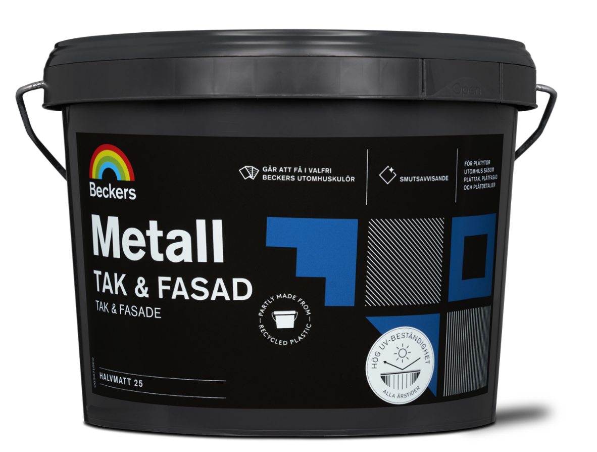 Metall Tak & Fasad: Semi-matt waterborne metal topcoat that is used on sheet metal roofs, sheet metal facades and sheet metal details. Intended for previously painted or primed surfaces. Has excellent UV-resistance and provides durable result.