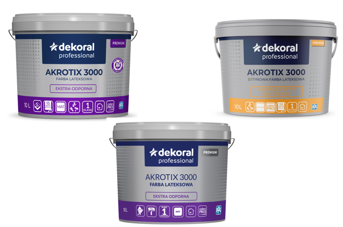 Akrotix 3000 Mat and Akrotix 3000 Satyna: The latex paint is intended for decorative coating of interior walls and ceilings with lime and cement plaster, gypsum plaster, concrete, drywall, textile wallpapers, paper and fibreglass wallpapers, textured plasterwork, and acrylic or latex paint coated surfaces. It is suitable for interiors in public and healthcare buildings and interiors in private housing.