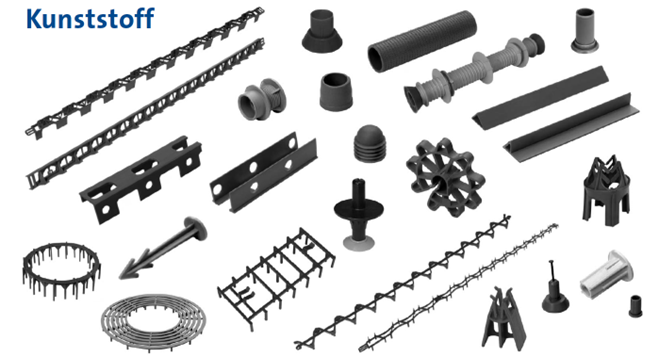The plastic spacers are used to maintain the distance between the outer wall and the reinforcement (steel).