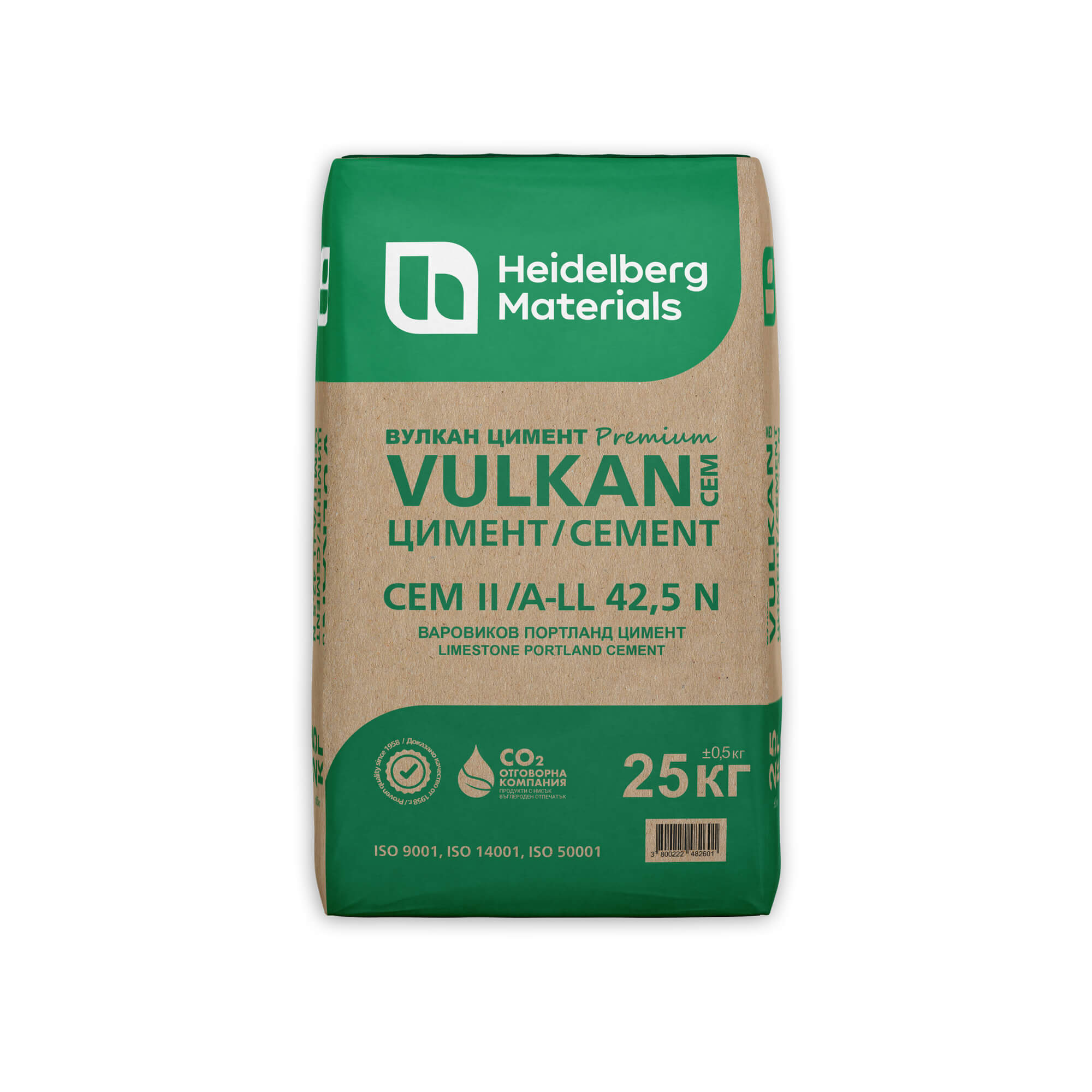 The specified product is a type of cement conforming to the composition of Portland Limestone Cement CEM II/A -LL 42.5 N. It is manufactured by Heidelberg Materials Bulgaria at the VULKAN plant.