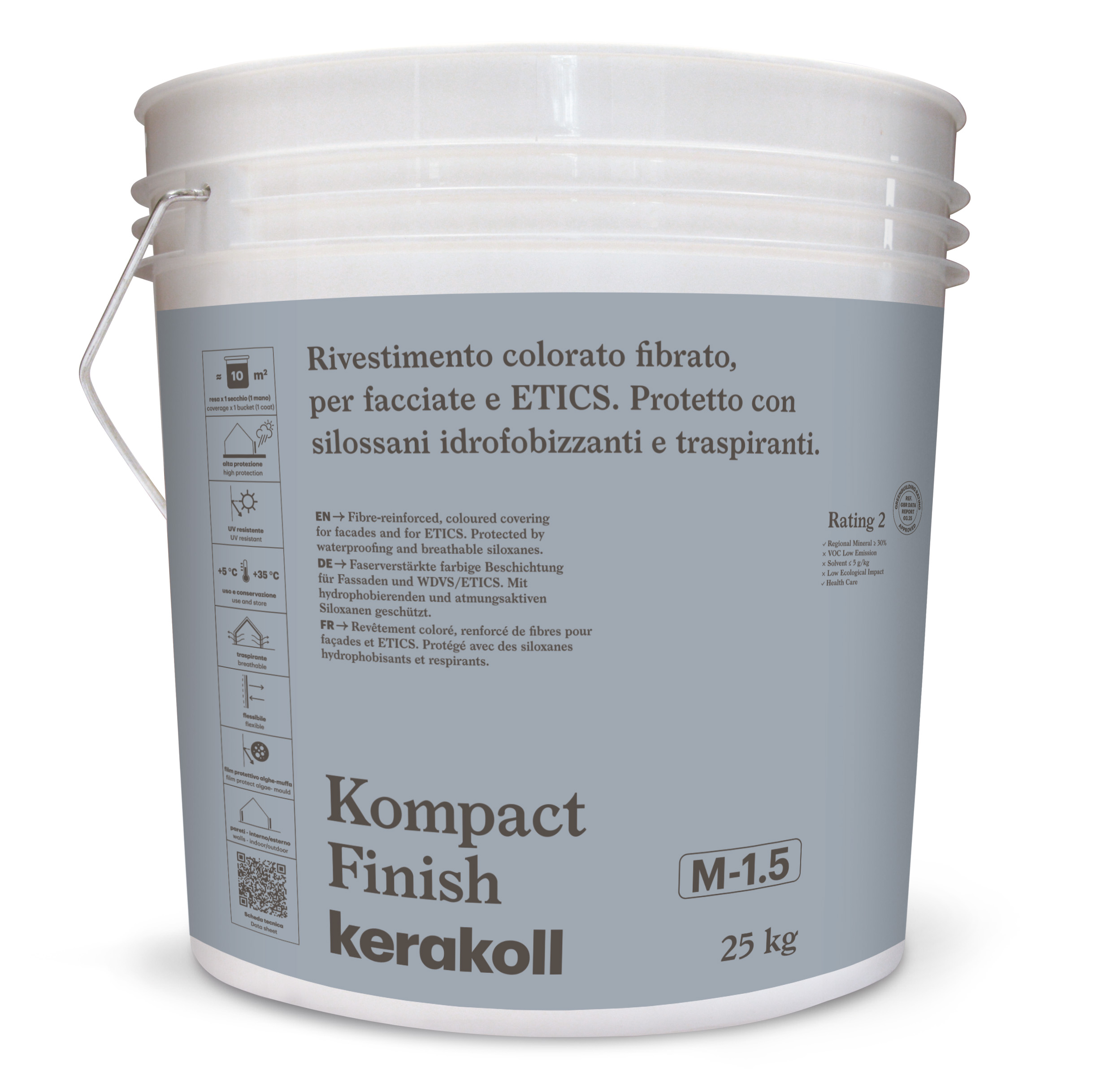 Kompact Finish is a fibre-reinforced, coloured acrylic-siloxane wall coating designed for decorative and protective applications on external and internal surfaces, particularly for ETICS (External Thermal Insulation Composite Systems). The product combines high vapour permeability (class V1, EN 7783) with low water absorption (class W3, EN 1062-3), ensuring long-term protection against atmospheric agents while maintaining breathability of the substrate.