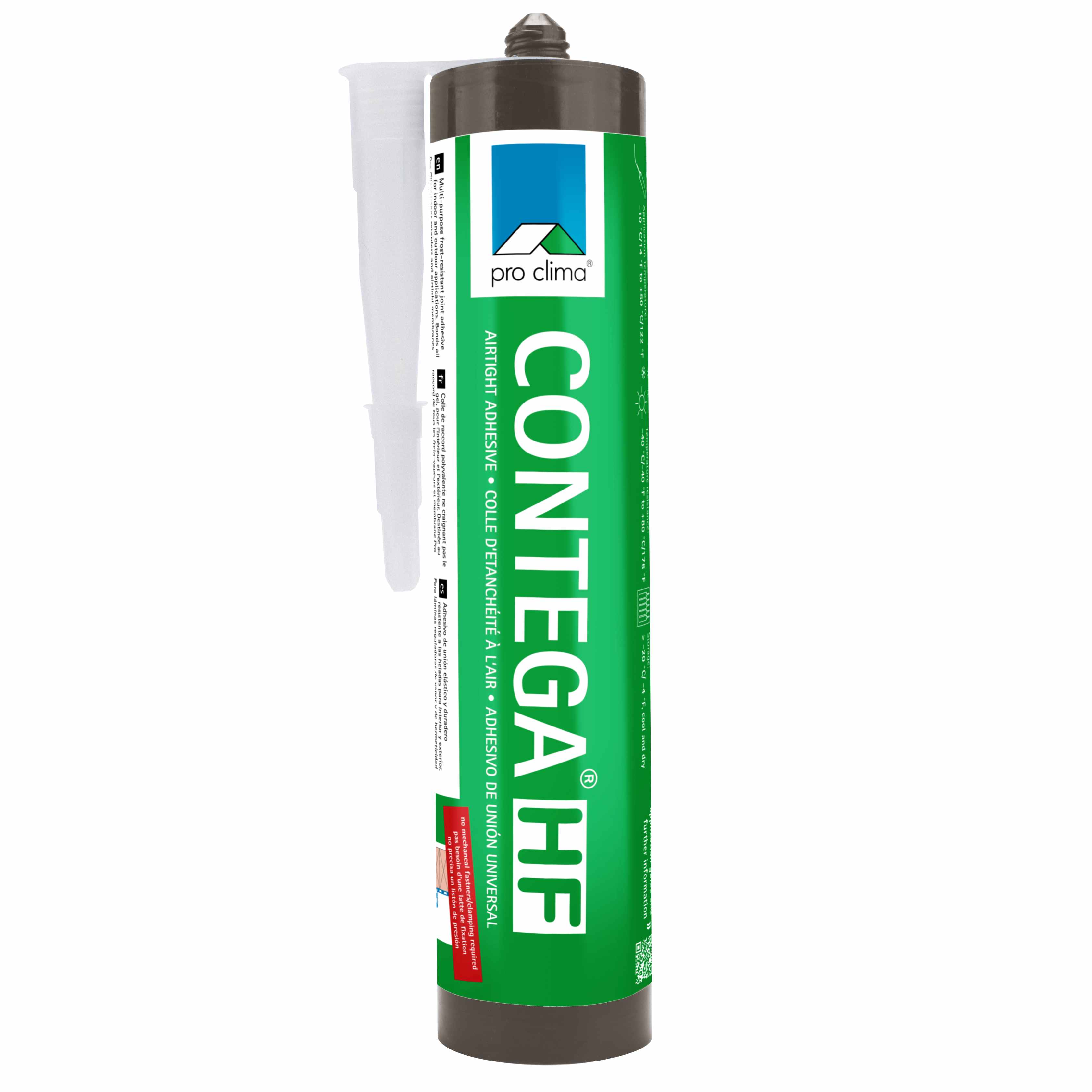 CONTEGA HF consists of a green coloured dispersion based on acrylic acid copolymers and ethanol. It is free from plasticisers and halogens. It ensures reliable joints: penetrates deep into the subsurface, remains elastic, ensures firm and permanently elastic adhesion. Once curing is complete, CONTEGA HF is insensitive to water and permanently elastic. It is part of the pro clima connection technology for permanent bonding and connections to adjacent components. It secures airtightness, wind- and rainproof connections. So it enables a reduction in heat loss from buildings from inside and water penetration from the outside. CONTEGA HF can be used on various surfaces like PP, PET, wood, wood-based panels, mineral, metal, pro clima vapour checks like INTELLO or roofing underlays like SOLITEX MENTO 3000 and more.
