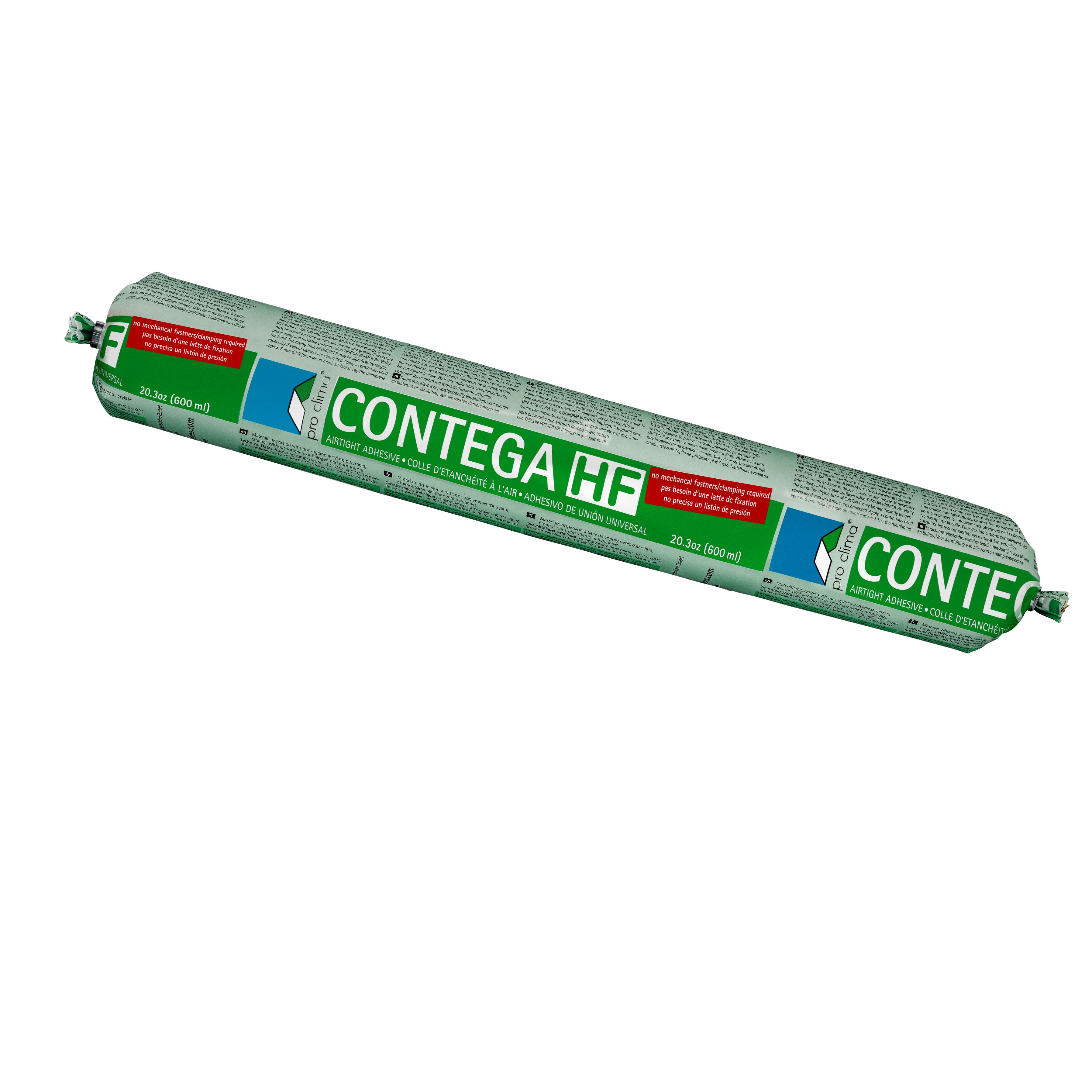 CONTEGA HF consists of a green coloured dispersion based on acrylic acid copolymers and ethanol. It is free from plasticisers and halogens. It ensures reliable joints: penetrates deep into the subsurface, remains elastic, ensures firm and permanently elastic adhesion. Once curing is complete, CONTEGA HF is insensitive to water and permanently elastic. It is part of the pro clima connection technology for permanent bonding and connections to adjacent components. It secures airtightness, wind- and rainproof connections. So it enables a reduction in heat loss from buildings from inside and water penetration from the outside. CONTEGA HF can be used on various surfaces like PP, PET, wood, wood-based panels, mineral, metal, pro clima vapour checks like INTELLO or roofing underlays like SOLITEX MENTO 3000 and more.