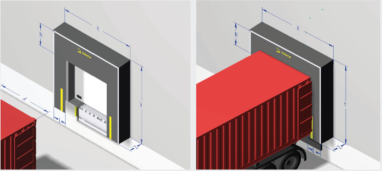 The ABRE Retractable Dock Shelter with a sloping roof consists of a perimeter structurewith a set of canvases attached to it. These canvases adjust to fit the body of the lorry. This structure is retractable so that, in the event of a knock or impact caused by the driver, the shelter will return to its initial position.