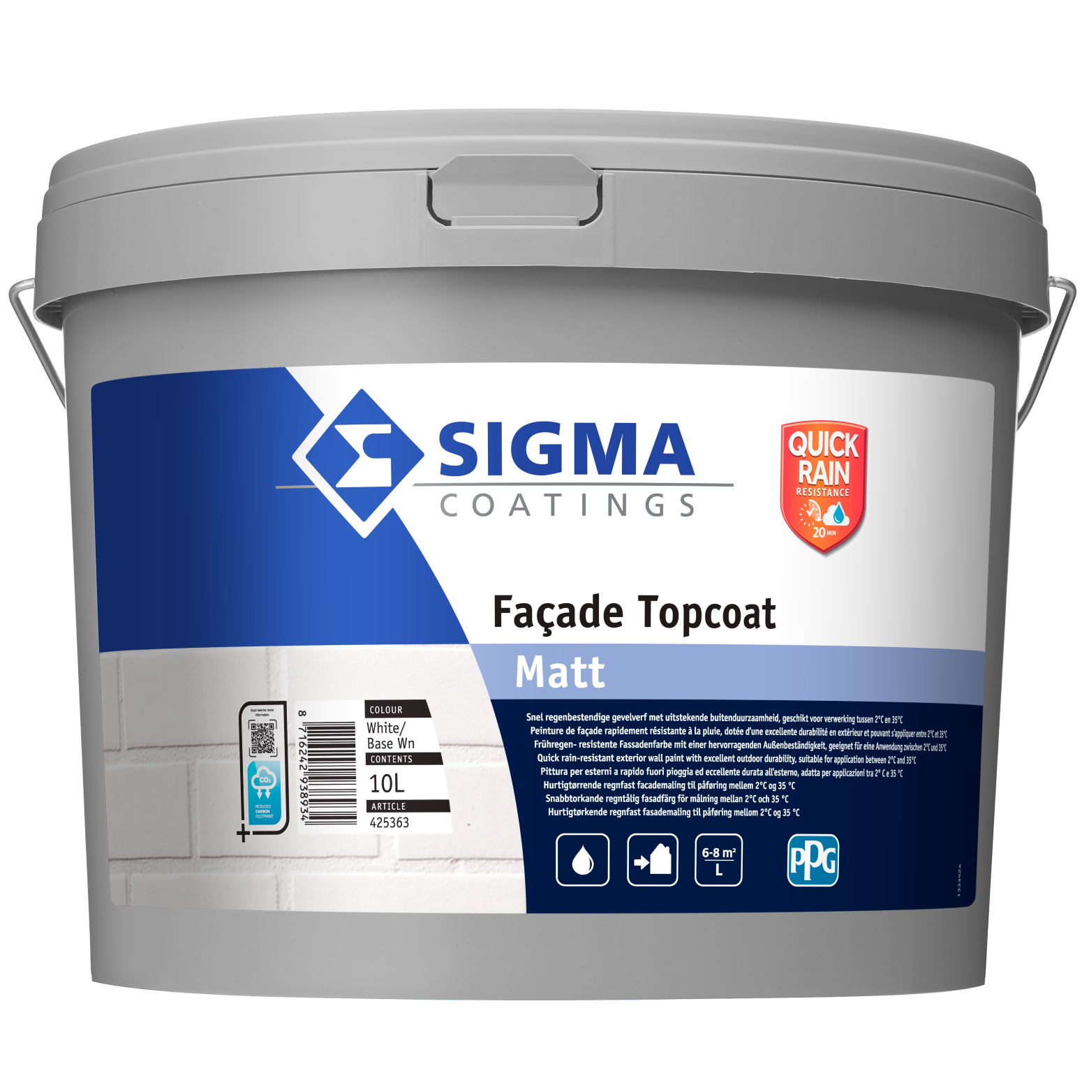 Sigma Facade Topcoat Matt is a quick rain-resistant exterior wall paint with excellent outdoor durability, suitable for application between 2°C and 35°C.