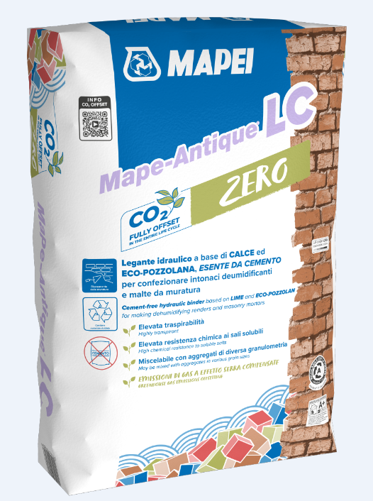 Mape-Antique LC is a salt-resistant hydraulic binder based on lime and Eco-Pozzolan, to be mixed with aggregates in various grain sizes to make de-humidifying renders and masonry mortars.