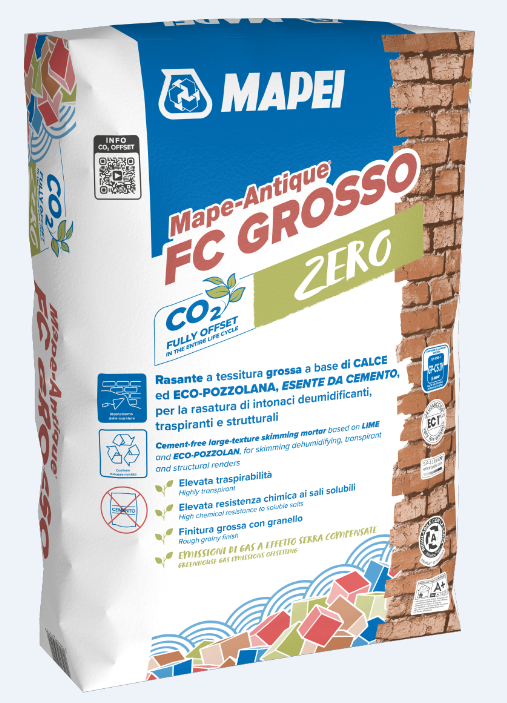 Mape-Antique FC Grosso is a salt-resistant, large-grained lime and Eco-Pozzolan cement-free, breathable skimming mortar for a rough finish on render.