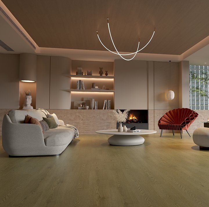 Vinyl Flooring (SPC) is made primarily from polyvinyl chloride (PVC), calcium carbonate (limestone), plasticizers, additives (such as pigments, stabilizers, etc.). It is composed of one clear PVC embossed wear layer with a final UV coating, printing film layer for décor, substrate layer for structural strength and stability, and IXPE layer to improve acoustic performance and increase comfort underfoot. The product is waterproof, easy to install and maintain. It is reliable and economical, and also environmentally friendly.