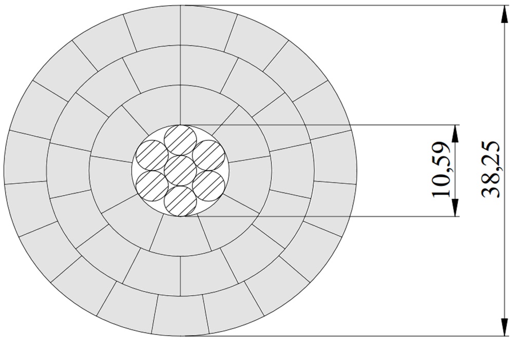 The overhead conductor AACSR/TW Ø38,25 mm Athabaska conductor consists in several galvanized steel wires and several shaped aluminium alloy wires stranded in layers.
