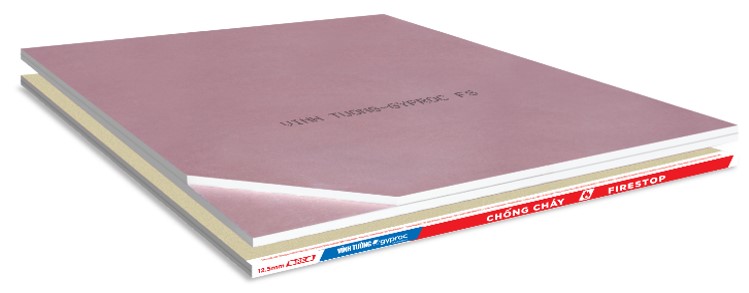 Vinh Tuong-Gyproc firestop plasterboard 12.5mm has a specialized pink paper layer and a special core consisting of glass fiber and micro silica additives. Vinh Tuong-Gyproc firestop plasterboard 12.5mm is suitable for use in indoor applications with high fire resistance requirements.