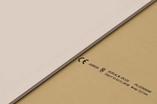 Laminated Plasterboard with double-sided cardboard and gypsum core of natural origin, manufactured by continuous rolling process, with the longitudinal edges refined and 15 mm of thicknesses.