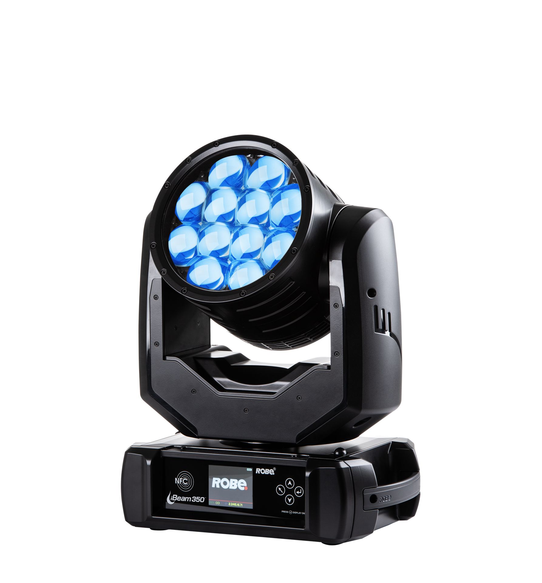 By including NFC (Near-Field Communication) technology, can user access setup, diagnostic and performance features, even without power, directly from mobile device using the Robe Com app. iBeam 350™ features a spectacular 3.8° to 52° zoom range and 7.800 lumen output from their 12 x 40W RGBW multichips with colour mixing available via CMY or RGB control.