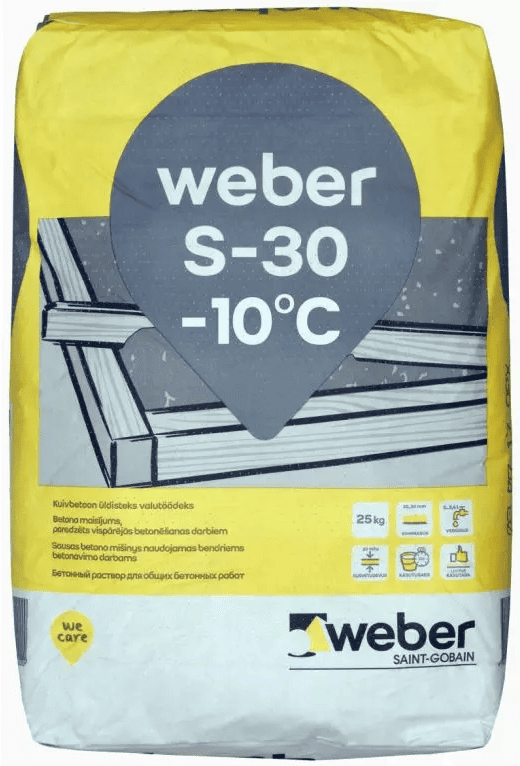 weber S-30 Talvine is a universal concrete mix for general casting works in winter conditions. It is suitable for pouring floor surfaces and pavement tiles, for grouting concrete panels, casting defects in concrete buildings for repair, leveling of plinths and for small scale for casting works. weber S-30 Talvine is suitable for indoor and outdoor use, with a minimum operating temperature of -10°C.