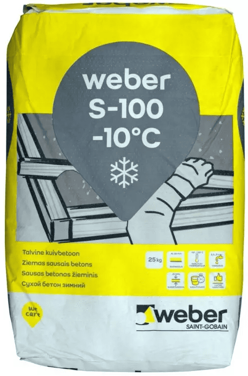weber S-100 Talvine is a universal and coarse-grained concrete mix for larger casting works in winter conditions. It is suitable for pouring floors, terraces, foundations, posts and other structural elements. weber S-100 Talvine is suitable for indoor and outdoor use, with a minimum operating temperature of -10°C.