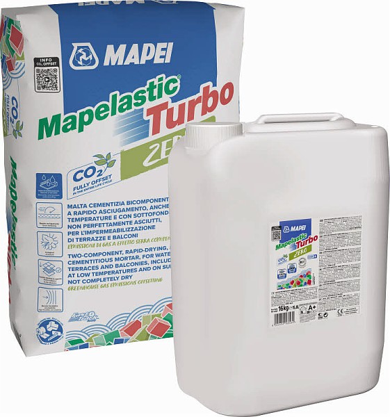 Mapelastic Turbo Zero is a two-component, rapid-drying elastic cementitious mortar for waterproofing terraces and balconies, including at low temperatures and on substrates not completely dry.