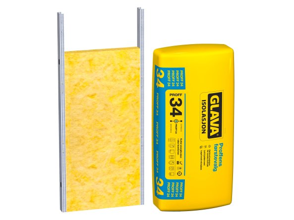 Glass wool slab in the Glava Proff 34 family to be used as thermal, acoustic and fire resisting insulation in constructions with steel studs. The width of the products is adapted to a center distance between the studs of 450 mm, 600 mm, and 900 mm. Classified as non-combustible building material (Euro class A1).