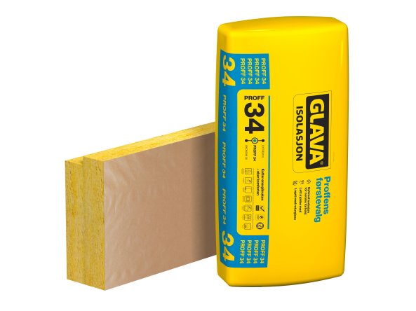 Glass wool slab in the Glava Proff 34 family coated with paper on one side. The product is designed to be used between the bottom chords in a roof truss, on cold, ventilated attics or lofts. Due to the width of the product, the top of the slab will cover the top of the bottom chord when the bottom cord has a height of max. 148 mm. The paper prevents air and dust to penetrate the insulation slab.