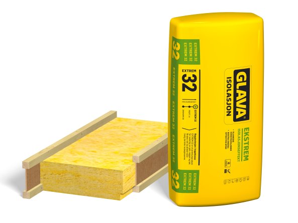 Glass wool slab in the Glava Extrem 32 family to be used where I-joists are used in constructions of floors, roofs, and external walls. The product has carvings for the flanges on two sides/edges.