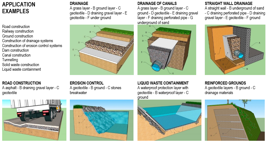 A geotextile is a product of the textile industry with physical, mechanical and hydraulic characteristics that make it suitable for use in civil engineering, in contact with the ground. Non-woven fabrics are made of synthetic fibres bonded by a mechanical process called needling. These products are non-toxic and free from chemical binders.