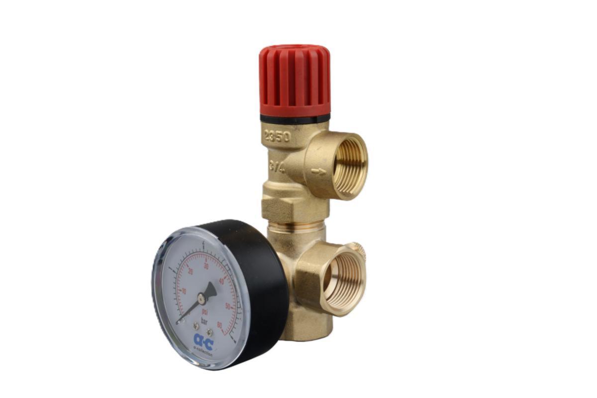 Safety modules with safety valve 1.5-2.5 bar opening pressure, pressure gauge 0-6 bar and venting screw. Max 0,10% lead content.