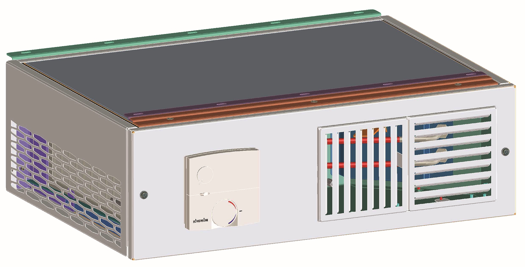 The secondary air drawn from the room passes through the filter and is appropriately cleaned and filtered. The room can be heated by passing secondary air through the chiller with an integrated electric tubular heater, where the air is heated and then returned to the room. For cooling the room, the secondary air also passes the chiller and is cooled depending on the water temperature. The secondary air can also be dehumidified by the chiller. The chiller consists of tubes and fins made from copper (2-pipe design). The fan, which uses energy-efficient EC technology, ensures that the individual comfort temperature is quickly reached.
