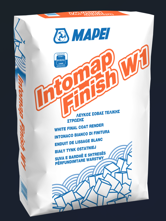 Intomap Finish W1 is a finish coat plaster - white ‘marble’, water repellent, made from white cement, lime, very fine-grain white marble aggregate and selected additives for internal and external use.