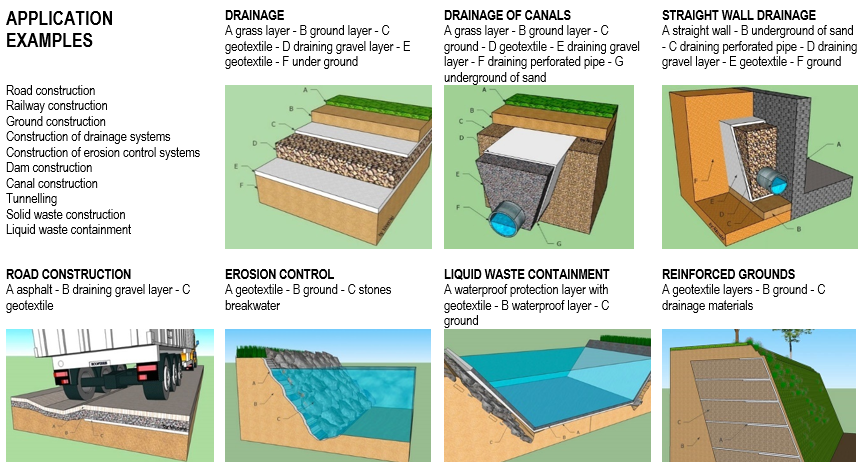 A geotextile is a product of the textile industry with physical, mechanical and hydraulic characteristics that make it suitable for use in civil engineering, in contact with the ground. Non-woven fabrics are made of synthetic fibres bonded by a mechanical process called needling. These products are non-toxic and free from chemical binders.