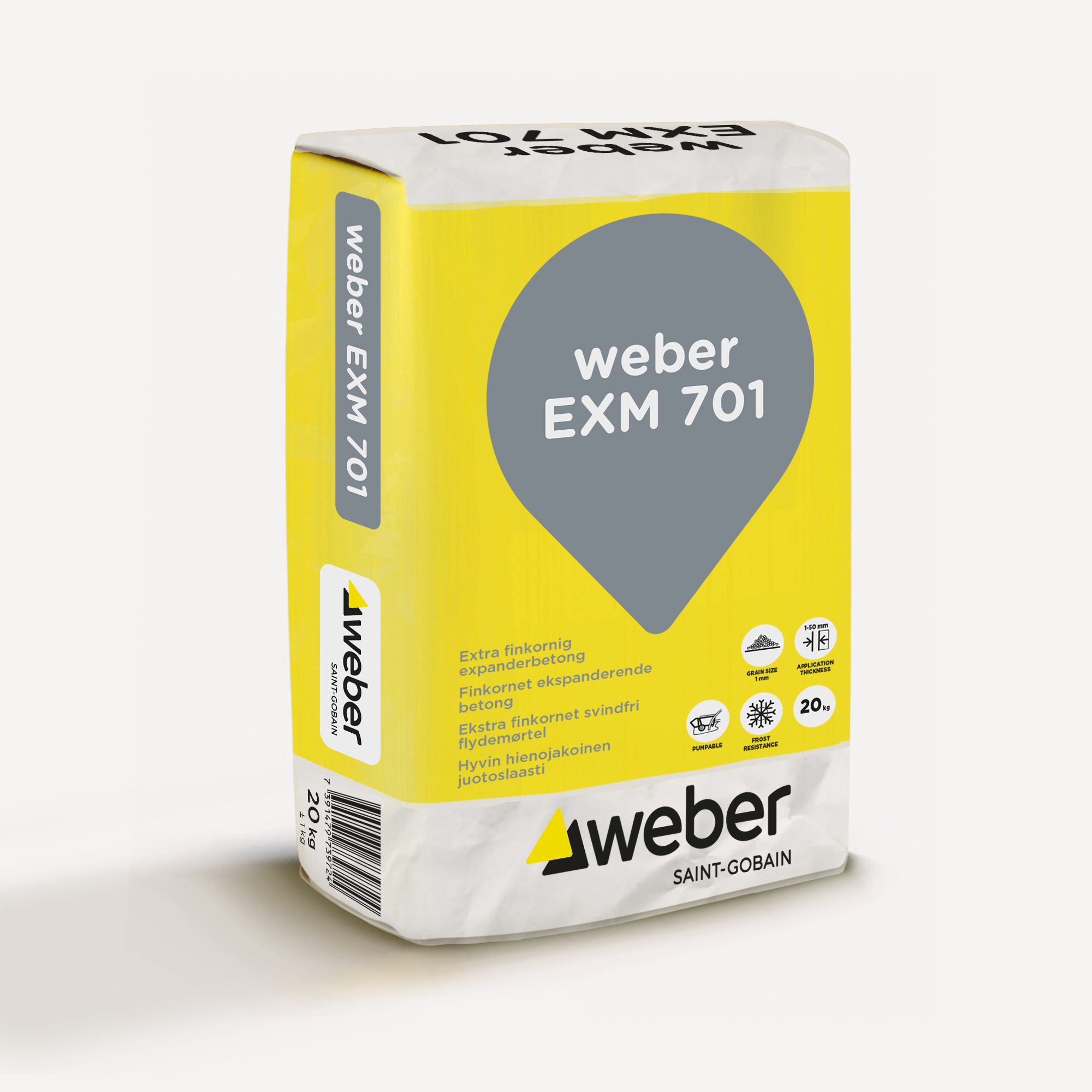 weber EXM 701 is a certified dry concrete to be mixed only with water to obtain a ready-to-use, lightly flowing, expanding, frost-resistant, un¬derpinning mortar. It is used in un¬derpinning, embedding and encasing of bridge bearings, steel and concrete piles, balustrade stands etc. and is also suitable for horizontal concrete laying and injection work.