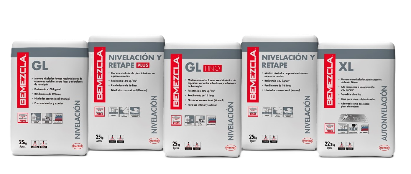 Leveling include five products: Bemezcla Nivelación GL, Bemezcla Nivelación y Retape Plus, Bemezcla Nivelación y Retape, Bemezcla Nivelación GL fino and Bemezcla Autonivelación XL. The products are cementitious levelling and self-levelling on concrete substrates for subsequent installation of coatings.