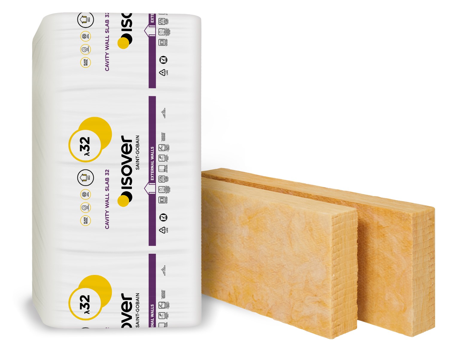Isover Cavity Wall Slab (CWS) 32 is a glass mineral wool slab providing thermal performance in external masonry cavity walls. Manufactured with a water repellent binder, the strong, resilient and flexible slabs are 455mm wide to fit between standard wall tie spacing.