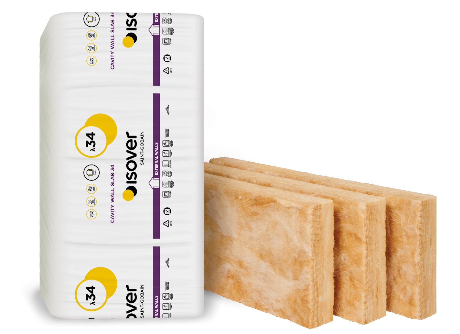 Isover Cavity Wall Slab (CWS) 34 is a glass mineral wool slab providing thermal performance in external masonry cavity walls. Manufactured with a water-repellent binder, the strong, resilient and flexible slabs are 455mm wide to fit between standard wall tie spacing.