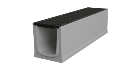 Drainage channel with anchoring system type I – until class F 900 according to EN 1433; triple-slot gratings class F 900 according to EN 1433.