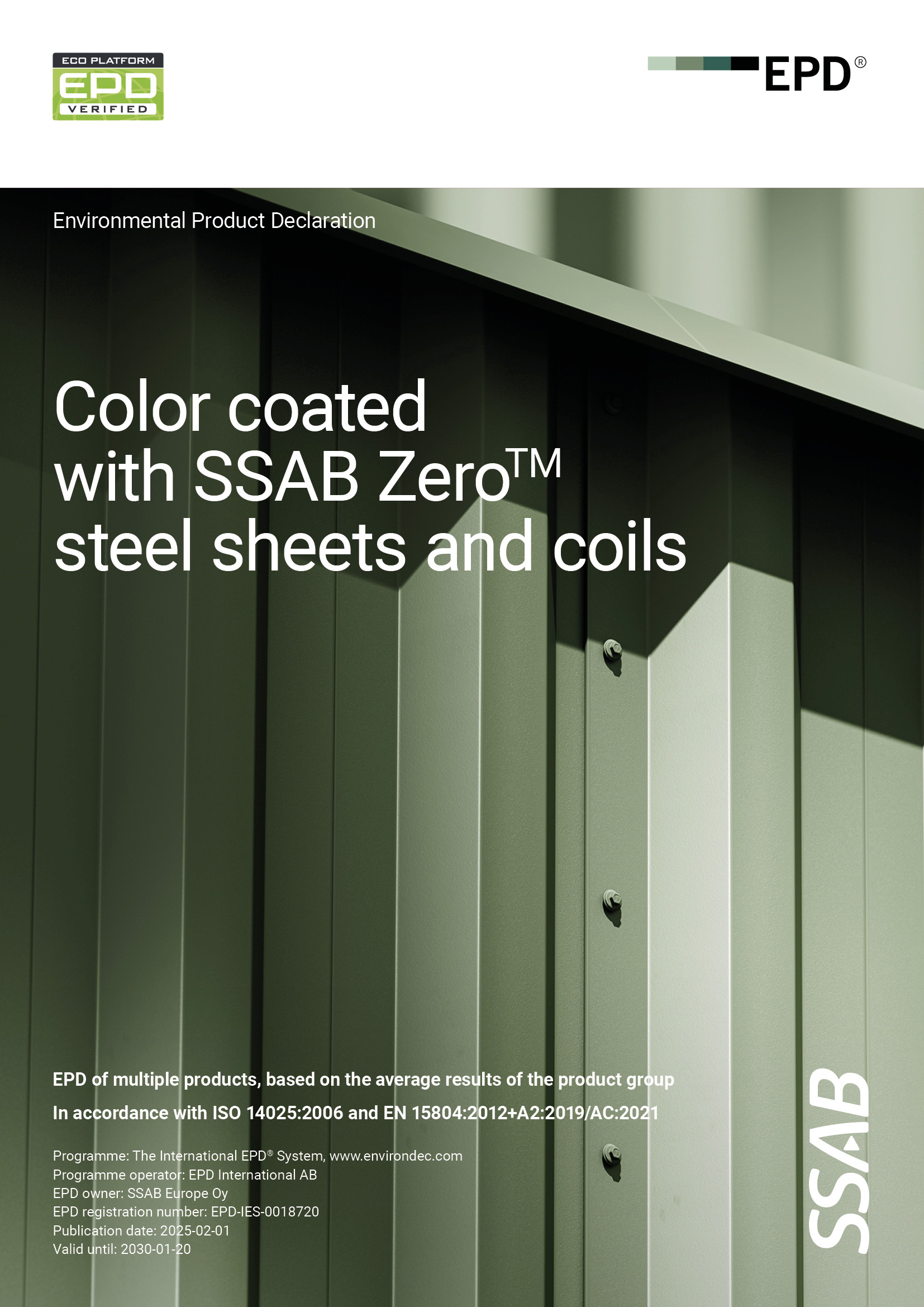 The scope of this EPD is GreenCoat® and color coated products with SSAB ZeroTM steels. SSAB ZeroTM is made using 100 % recycled steel, of which over 90 % comes from external scrap (post- and pre-consumer) and the remainder from internal scrap from the manufacturing process.