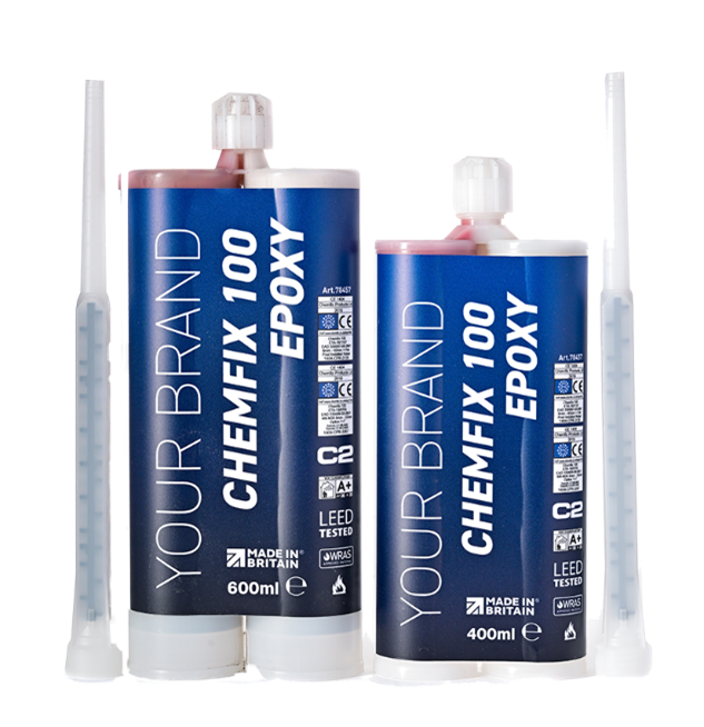 Chemfix 100 is a solvent free two component pure epoxy resin based chemical anchoring injection system produced by Chemfix Products Ltd. It was developed principally to anchor threaded rods and rebar into cracked and uncracked concrete and in dynamic applications such as Seismic. Suitable for Post Install Rebar applications for concrete connections. Used widely for heavy duty professional applications.