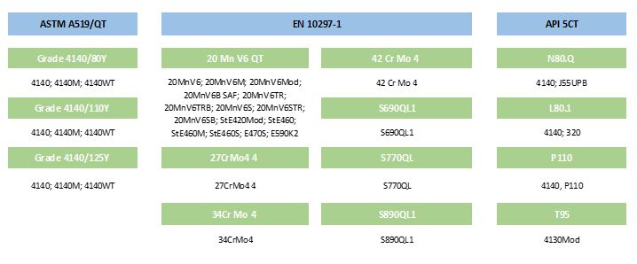 Low alloy hot rolled mechanical seamless steel tubes with quenching and tempering heat treatment produced according to the standards.