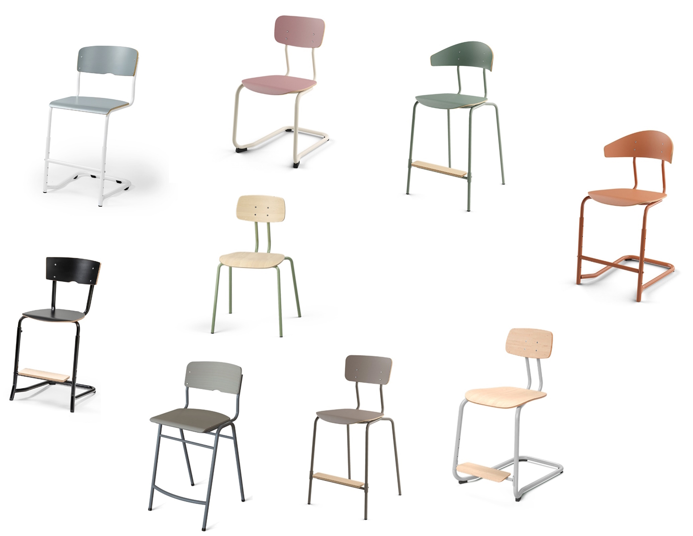The Student chair series are designed to fit the environment of a classroom. The chair series is offered in different models and heights, with a possible selection of either a four-legged chair or an arch-legged chair. Some of the models are further available with a footrest. The models declared in this EPD are Sense, Mind, Henrik, Liv, Gustav and Maria.