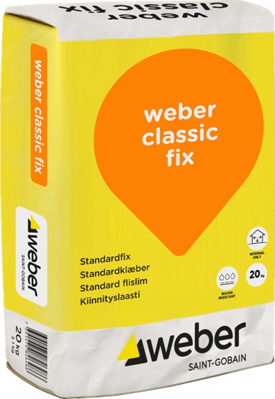weber classic fix is an adhesive for laying ceramic tiles when building and renovating indoors on concrete substrates (older than 6 months), lightweight concrete, gypsum board, Leca®, and masonry (plastered/filled with cement-based plasters, approved gypsum plaster, or mineral-bonded filler). Read and follow the instructions and product data sheets
