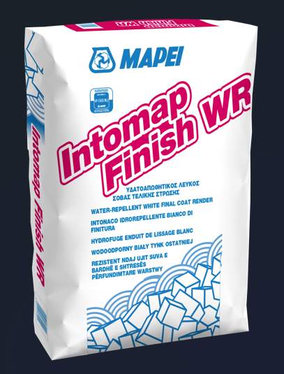 Intomap Finish WR is coat plaster - white ‘Marble’, water repellent, made from white cement, lime, very fine-grained white marble aggregate and selected additives for internal and external use.