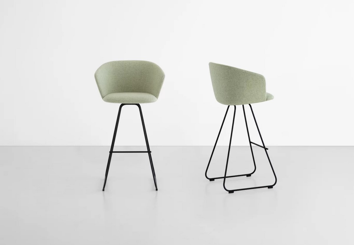 Ergonomics and maximum comfort. These are the strengths of GLOVE, the upholstered stool recognisable by its high backrest that sustains the back and by a comfortable padding that envelops the entire seat. The softness of the lines is extended to the base, designed as a sled with a metal rod, which has a wide curvature both under the hook plate with the seat, and in the two lower parts where the sled ends.