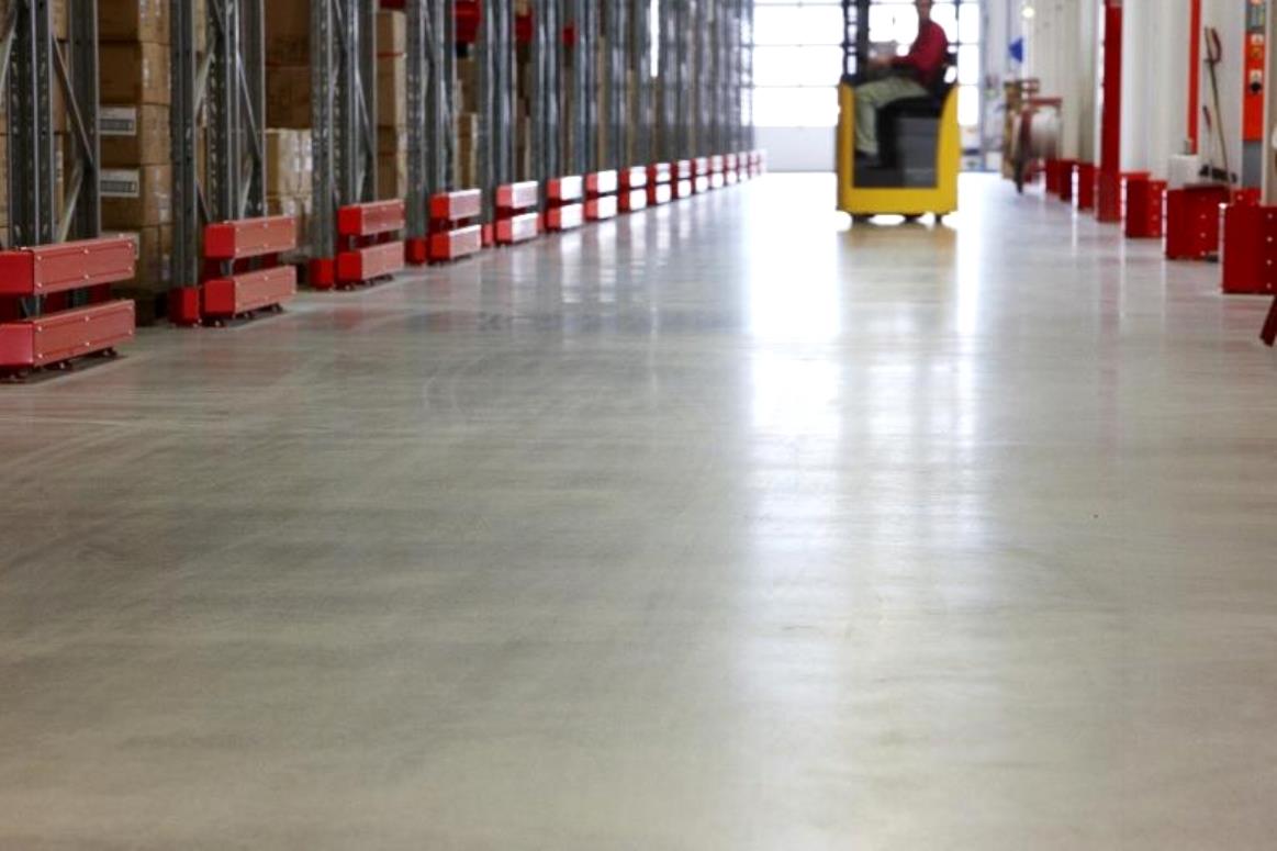 Teqton System Floor is made as a joint free roller compacted concrete floor with a polymer reinforced wear layer on top. The base layer is an 18cm thick roller compacted concrete with no iron reinforcements. The top wear layer is a 2cm thick polymer reinforced concrete consisting of granite, sand, cement and liquid polymer.