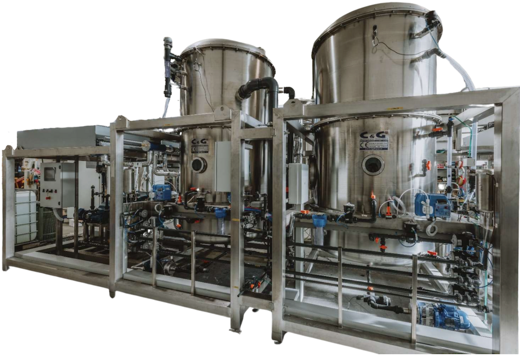 The DEPC series of vacuum evaporators allows industrial wastewaters to be treated and concentrated with the production of a high quality distillate and a concentrate of the raw materials or pollutants present. Double effect evaporators consist of two stages, which are kept at different pressures by apposite vacuum pumps to obtain boiling at decreasing temperatures. Energy consumption is reduced to a minimum by using a heat pump in a vacuum, with evaporation occurring at very low temperature of around 35°C. The distillate can be recycled back into the industry, raw materials can be recovered and the volume of final wastewater to be sent away is reduced to a minimum.